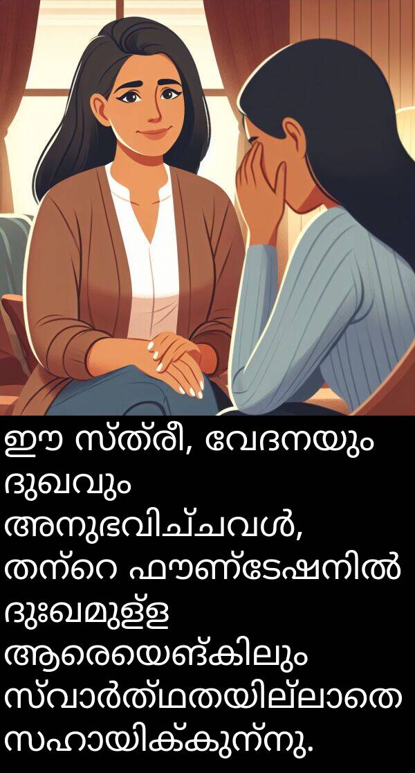 ഈ സ്ത്രീ, വേദനയും ദുഖവും അനുഭവിച്ചവൾ, തന്റെ ഫൗണ്ടേഷനിൽ ദുഃഖമുള്ള ആരെയെങ്കിലും സ്വാർത്ഥതയില്ലാതെ സഹായിക്കുന്നു.