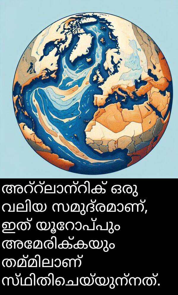 അറ്റ്ലാന്റിക് ഒരു വലിയ സമുദ്രമാണ്, ഇത് യൂറോപ്പും അമേരിക്കയും തമ്മിലാണ് സ്ഥിതിചെയ്യുന്നത്.