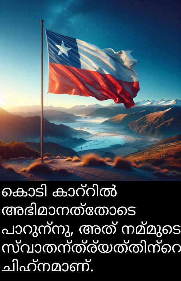 കൊടി കാറ്റിൽ അഭിമാനത്തോടെ പാറുന്നു, അത് നമ്മുടെ സ്വാതന്ത്ര്യത്തിന്റെ ചിഹ്നമാണ്.