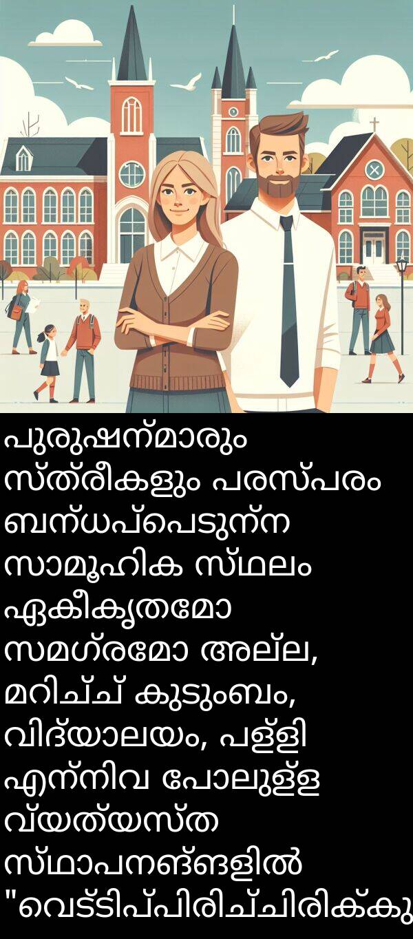 പുരുഷന്മാരും സ്ത്രീകളും പരസ്പരം ബന്ധപ്പെടുന്ന സാമൂഹിക സ്ഥലം ഏകീകൃതമോ സമഗ്രമോ അല്ല, മറിച്ച് കുടുംബം, വിദ്യാലയം, പള്ളി എന്നിവ പോലുള്ള വ്യത്യസ്ത സ്ഥാപനങ്ങളിൽ "വെട്ടിപ്പിരിച്ചിരിക്കുന്നു".