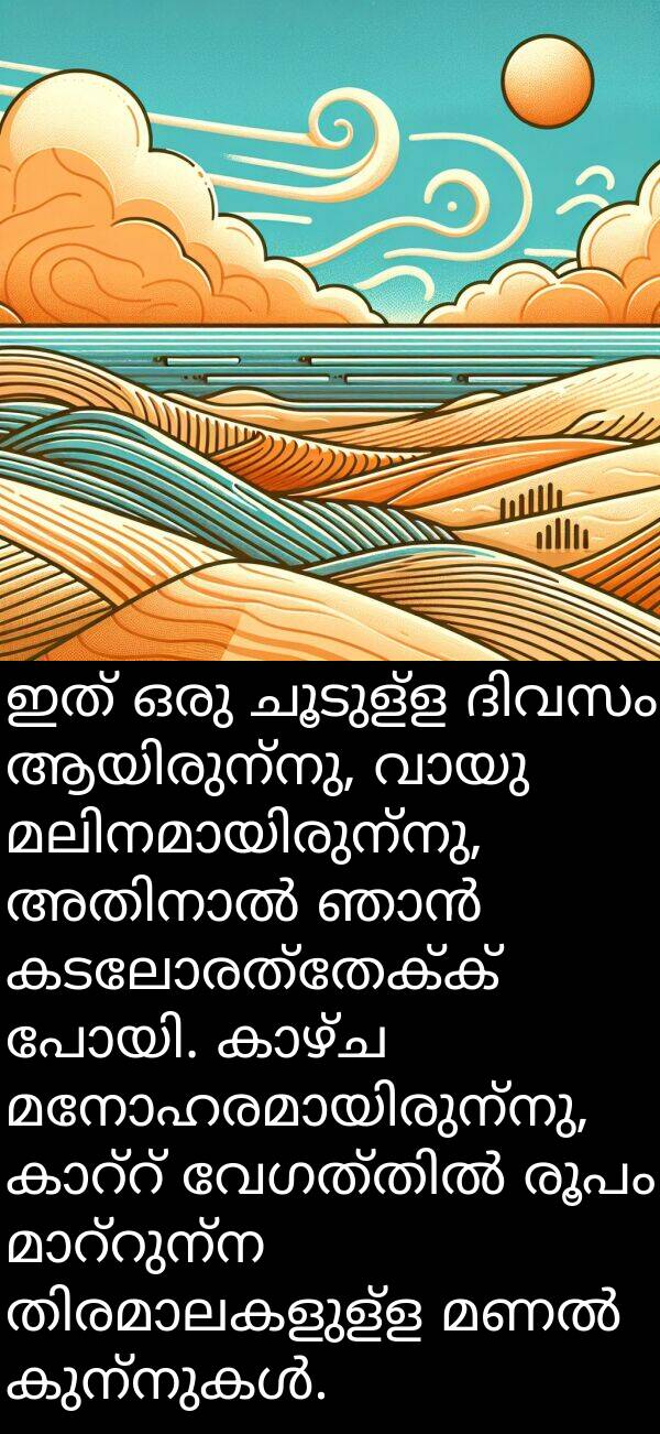 ഇത് ഒരു ചൂടുള്ള ദിവസം ആയിരുന്നു, വായു മലിനമായിരുന്നു, അതിനാൽ ഞാൻ കടലോരത്തേക്ക് പോയി. കാഴ്ച മനോഹരമായിരുന്നു, കാറ്റ് വേഗത്തിൽ രൂപം മാറ്റുന്ന തിരമാലകളുള്ള മണൽ കുന്നുകൾ.