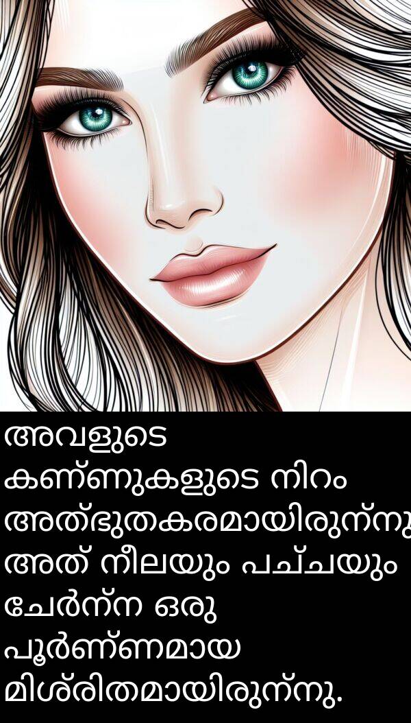 അവളുടെ കണ്ണുകളുടെ നിറം അത്ഭുതകരമായിരുന്നു. അത് നീലയും പച്ചയും ചേർന്ന ഒരു പൂർണ്ണമായ മിശ്രിതമായിരുന്നു.