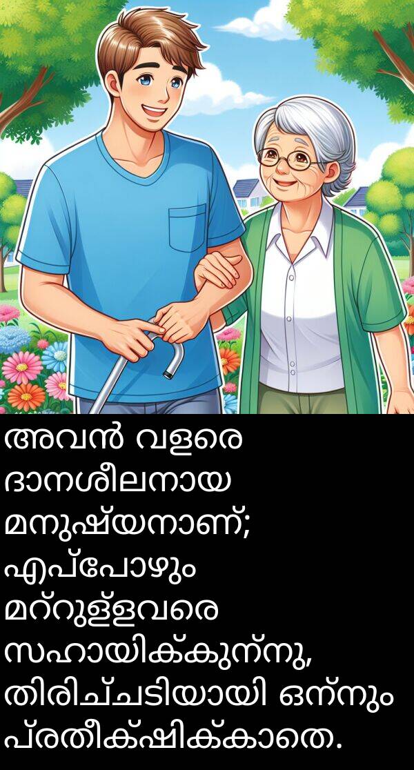 അവൻ വളരെ ദാനശീലനായ മനുഷ്യനാണ്; എപ്പോഴും മറ്റുള്ളവരെ സഹായിക്കുന്നു, തിരിച്ചടിയായി ഒന്നും പ്രതീക്ഷിക്കാതെ.