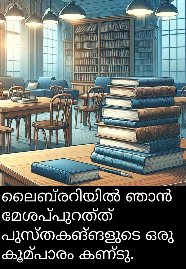 ലൈബ്രറിയിൽ ഞാൻ മേശപ്പുറത്ത് പുസ്തകങ്ങളുടെ ഒരു കൂമ്പാരം കണ്ടു.