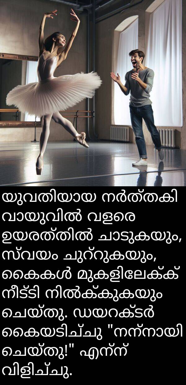 യുവതിയായ നർത്തകി വായുവിൽ വളരെ ഉയരത്തിൽ ചാടുകയും, സ്വയം ചുറ്റുകയും, കൈകൾ മുകളിലേക്ക് നീട്ടി നിൽക്കുകയും ചെയ്തു. ഡയറക്ടർ കൈയടിച്ചു "നന്നായി ചെയ്തു!" എന്ന് വിളിച്ചു.
