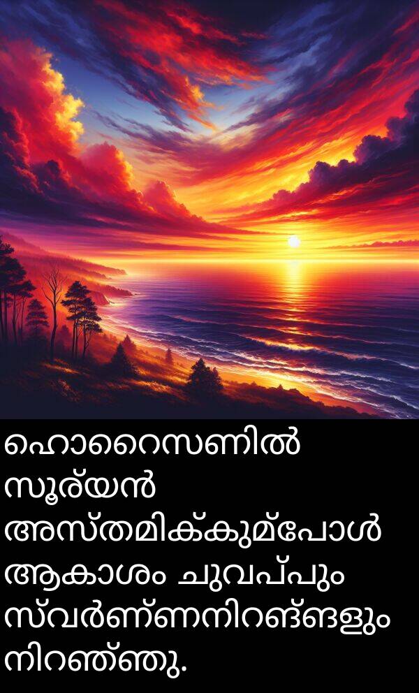 സൂര്യൻ അസ്തമിക്കുമ്പോൾ ആകാശത്തിലെ നിറങ്ങൾ ചുവപ്പും ഓറഞ്ചും പർപ്പിളും ചേർന്ന് ഒരു നൃത്തം ആവിഷ്കരിക്കുന്നു.